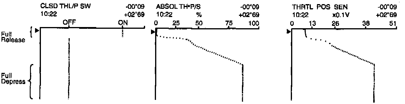 Below is the data for "THRTL POS SEN", "ABSOL TH.P/S" and "CLSD THL/P SW" when depressing the accelerator pedal with the ignition switch "ON".