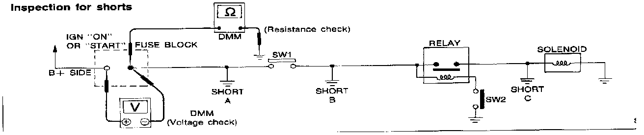 Voltage: Short is down the circuit of the relay or between the relay and the disconnected solenoid (point C).