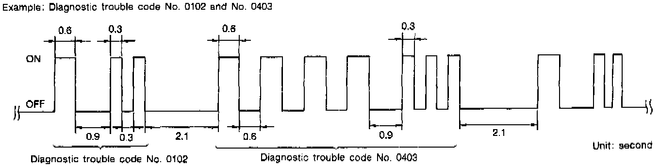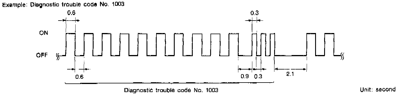 Long (0.6 second) blinking indicates the two LH digits of number and short (0.3 second) blinking indicates the two RH digits of number. For example, the malfunction indicator lamp blinks 10 times for 6 seconds (0.6 sec x 10 times) and then it blinks three times for about 1 second (0.3 sec x 3 times). This indicates the DTC "1003" and refers to the malfunction of the neutral position switch.