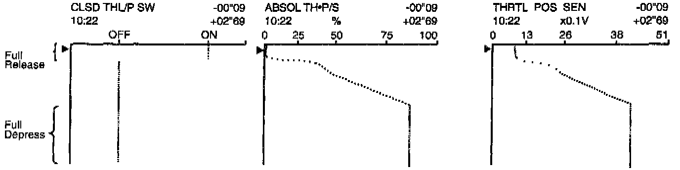 The following are the major sensor reference graphs in "DATA MONITOR" mode.(Select "HI SPEED" in "DATA MONITOR" with CONSULT.)THRTL POS SEN, ABSOL TH.P/S, CLSD THL/P SW
