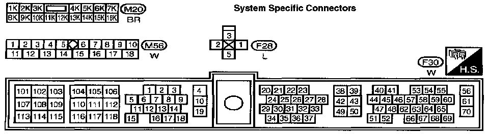 M8, E65 Main Harness and Engine room harness terminal arrangements