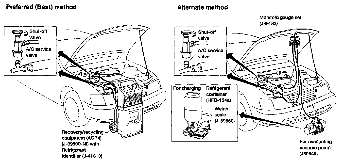 WARNING: Avoid breathing A/C refrigerant and lubricant vapor or mist. Exposure may irritate eyes, nose and throat. Remove R-134a from the A/C system using certified service equipment meeting requirements of SAE J2210 (R-134a recycling equipment) or J2209 (R-134a recovery equipment). If accidental system discharge occurs, ventilate work area before resuming service. Additional health and safety information may be obtained from refrigerant and lubricant manufacturers.