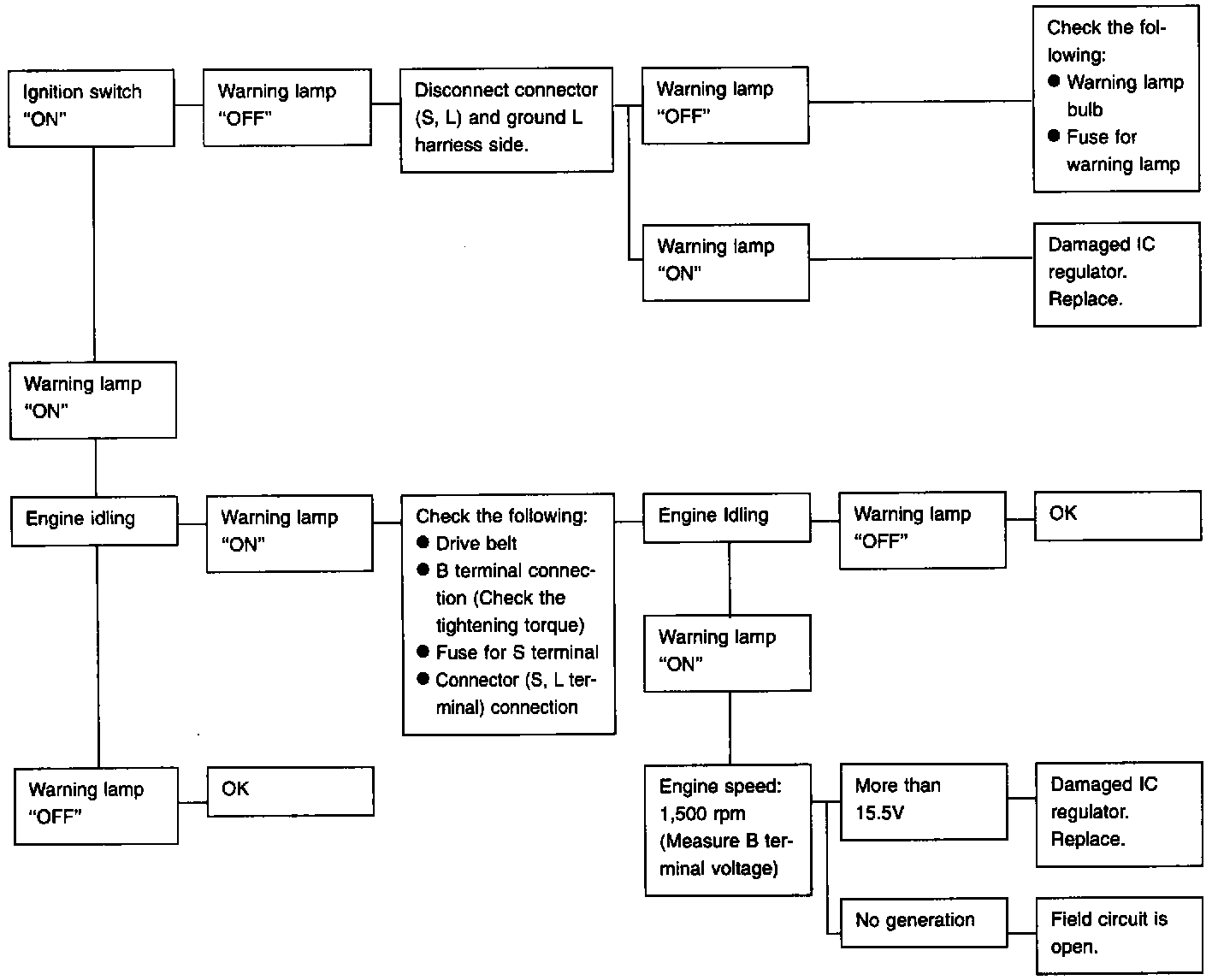*:When field circuit is open, check condition of rotor coil, rotor slip ring and brush. If necessary, replace faulty parts with new ones.