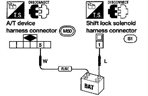 - Check operation by applying battery voltage to A/T device harness terminal (5) and shift lock solenoid harness terminal (1).