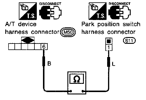 - Check continuity between A/T device harness terminal (6) and park position switch harness terminal (1).