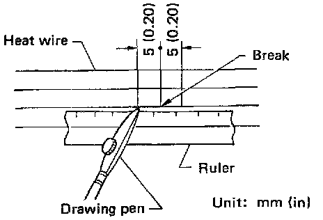 3. Place ruler on glass along broken line. Deposit conductive silver composition on break with drawing pen. Slightly overlap existing heat wire on both sides [preferably 5 mm (0.20 in)] of the break.