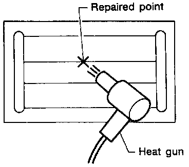 5. Apply a constant stream of hot air directly to the repaired area for approximately 20 minutes with a heat gun. A minimum distance of 3 cm (1.2 in) should be kept between repaired area and hot air outlet. If a heat gun is not available, let the repaired area dry for 24 hours