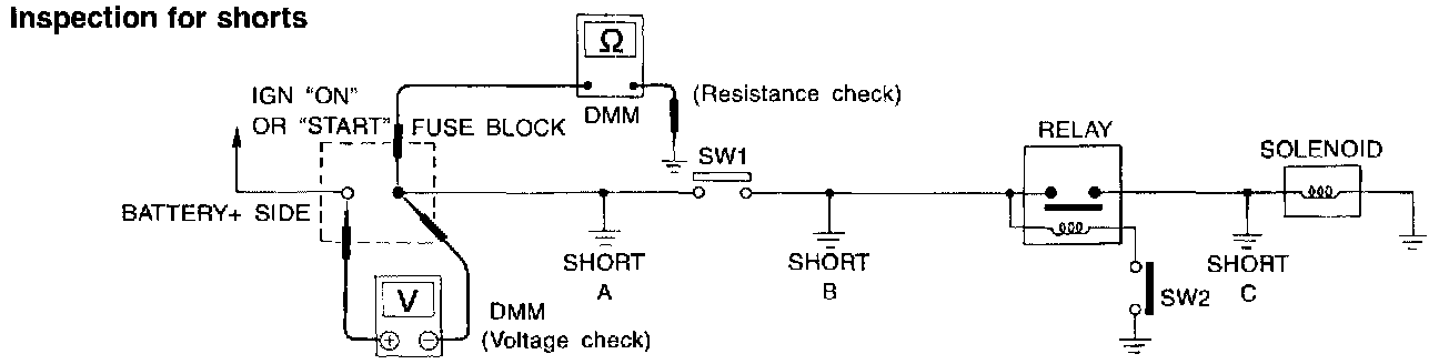 Voltage: Short is down the circuit of the relay or between the relay and the disconnected solenoid (point C).