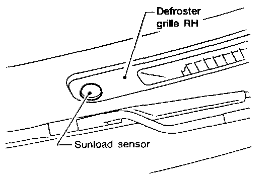 The sunload sensor is located on the right defroster grille. It detects sunload entering through windshield by means of a photo diode and converts it into a current value which is then input to the auto amp.