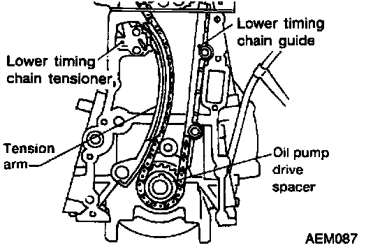 3. Install the idler sprocket and lower timing chain using the mating marks and the paint marks made during the removal process.