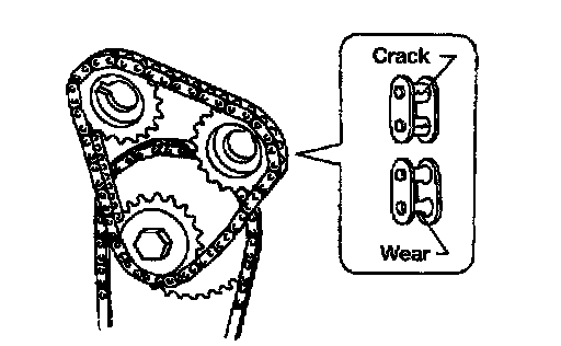 Check for cracks and excessive wear at roller links. Replace chain if necessary.