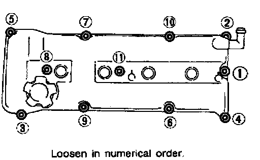 b. Tighten nuts and bolts to (1) to (11) in numerical order to 8 to 11 Nm (0.8 to 1.1 kg-m, 69 to 95 inch lbs.). Install all spark plugs with high-tension cords.