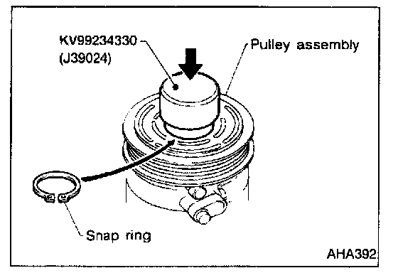 - Install the pulley assembly using the installer and a hand press, and then install the snap ring using snap ring pliers.