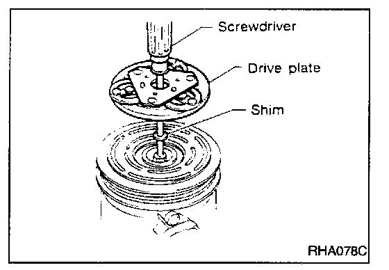 While tightening the center bolt, insert a round bar (screwdriver, etc.) between two of the pins (as shown in the figure) to prevent drive plate rotation. After removing the drive plate, remove the shims from either the drive shaft or the drive plate.