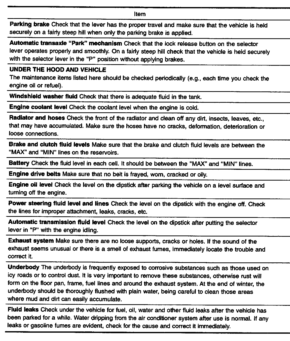 General maintenance includes those items which should be checked during normal day-to-day operation of the vehicle. They are essential if the vehicle is to continue operating properly. The owners can perform checks and inspections themselves or have their NISSAN dealers do them.