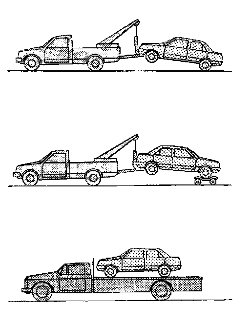 - When towing, make sure that the transmission, steering system and power train are in good order. If any unit is damaged, dollies must be used.
