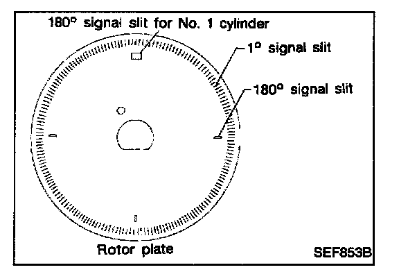 The camshaft position sensor has a rotor plate and a wave- forming circuit. The rotor plate has 360 slits for a 1° (POS) signal and 4 slits for a 180° (REF) signal. The wave-forming circuit consists of Light Emitting Diodes (LED) and photo diodes. The rotor plate is positioned between the LED and the photo diode. The LED transmits light to the photo diode. As the rotor plate turns, the slits cut the light to generate rough-shaped pulses. These pulses are converted into on-off signals by the wave-forming circuit and sent to the ECM.