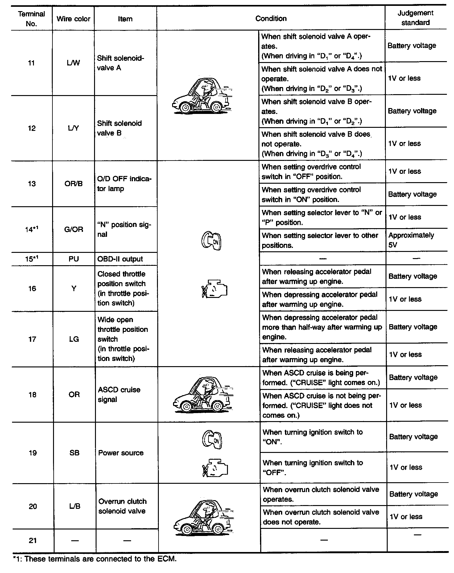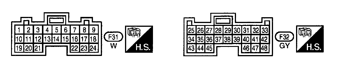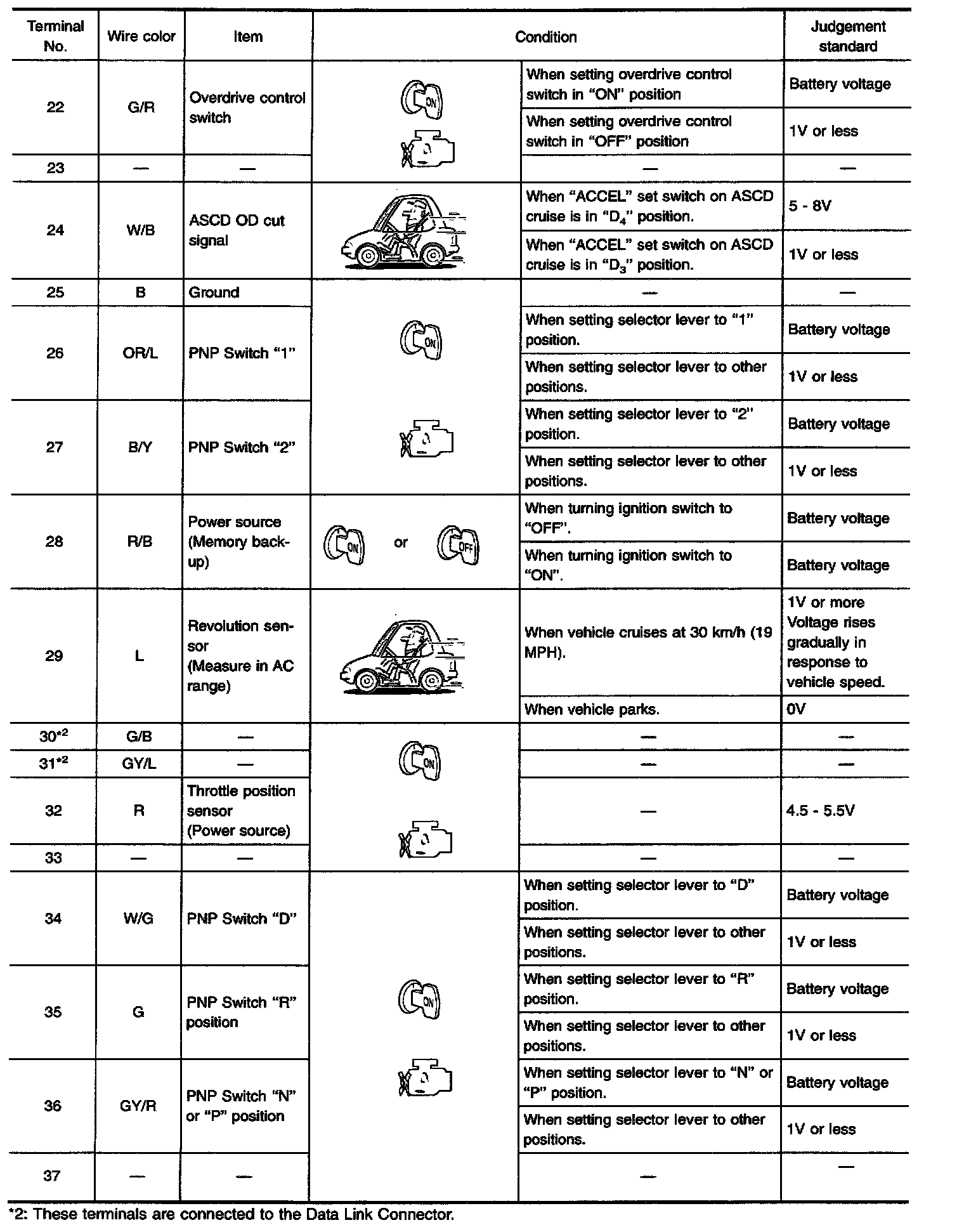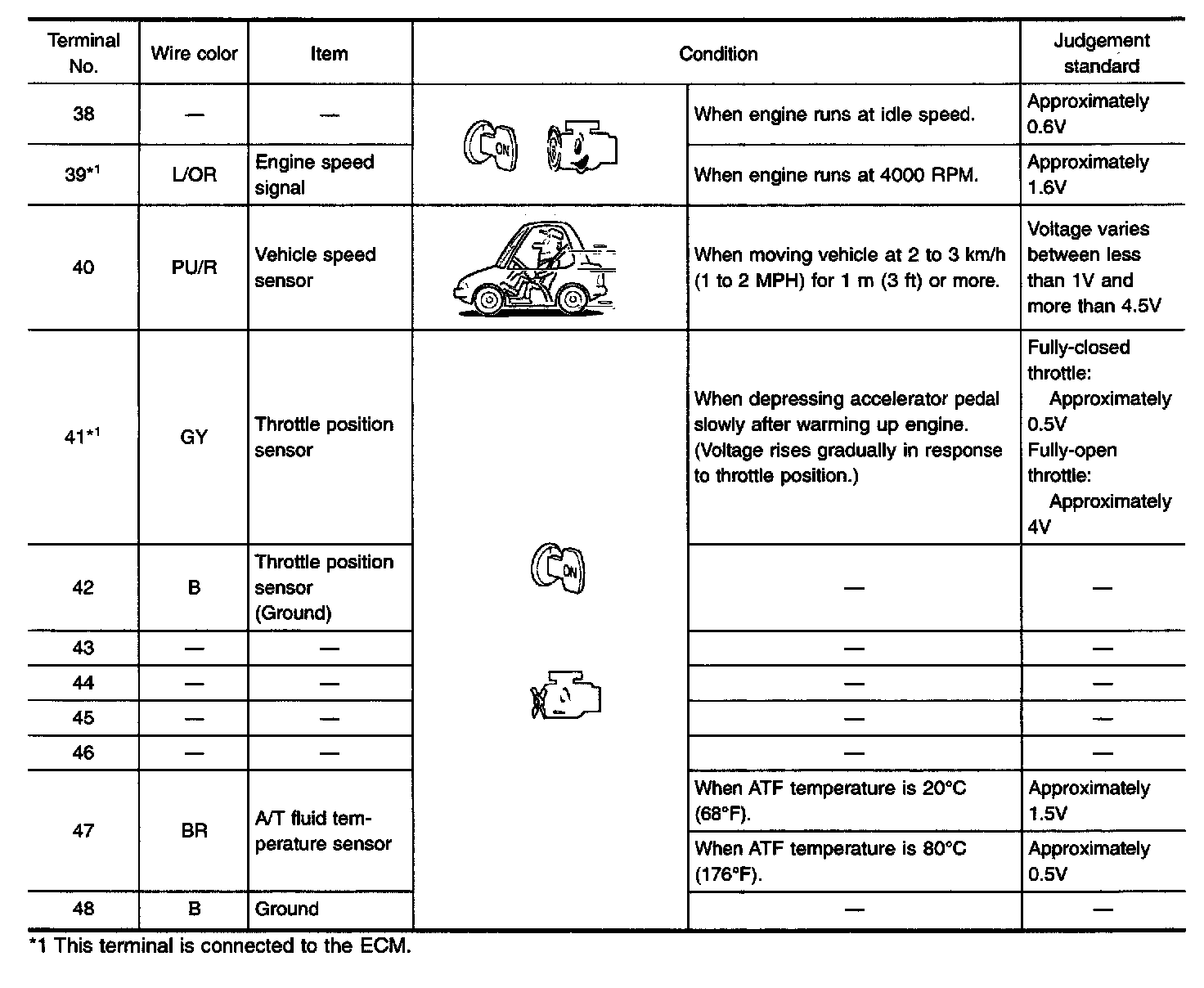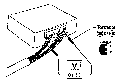 - Measure voltage between each terminal and terminal 25 or 48 by following "TCM INSPECTION TABLE".