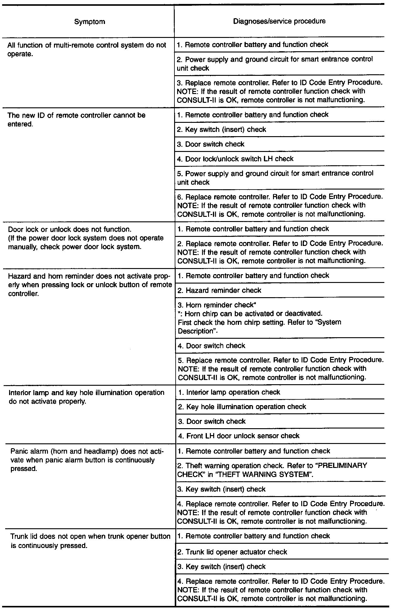 - The panic alarm operation and trunk lid opener operation of multi-remote control system do not activate with the ignition key inserted in the ignition key cylinder.
