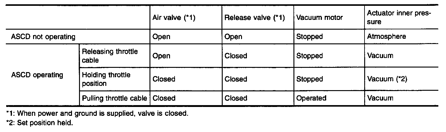 Ground is supplied to vacuum motor, air valve and release valve from ASCD control unit depending on the operated condition as shown in the below table.