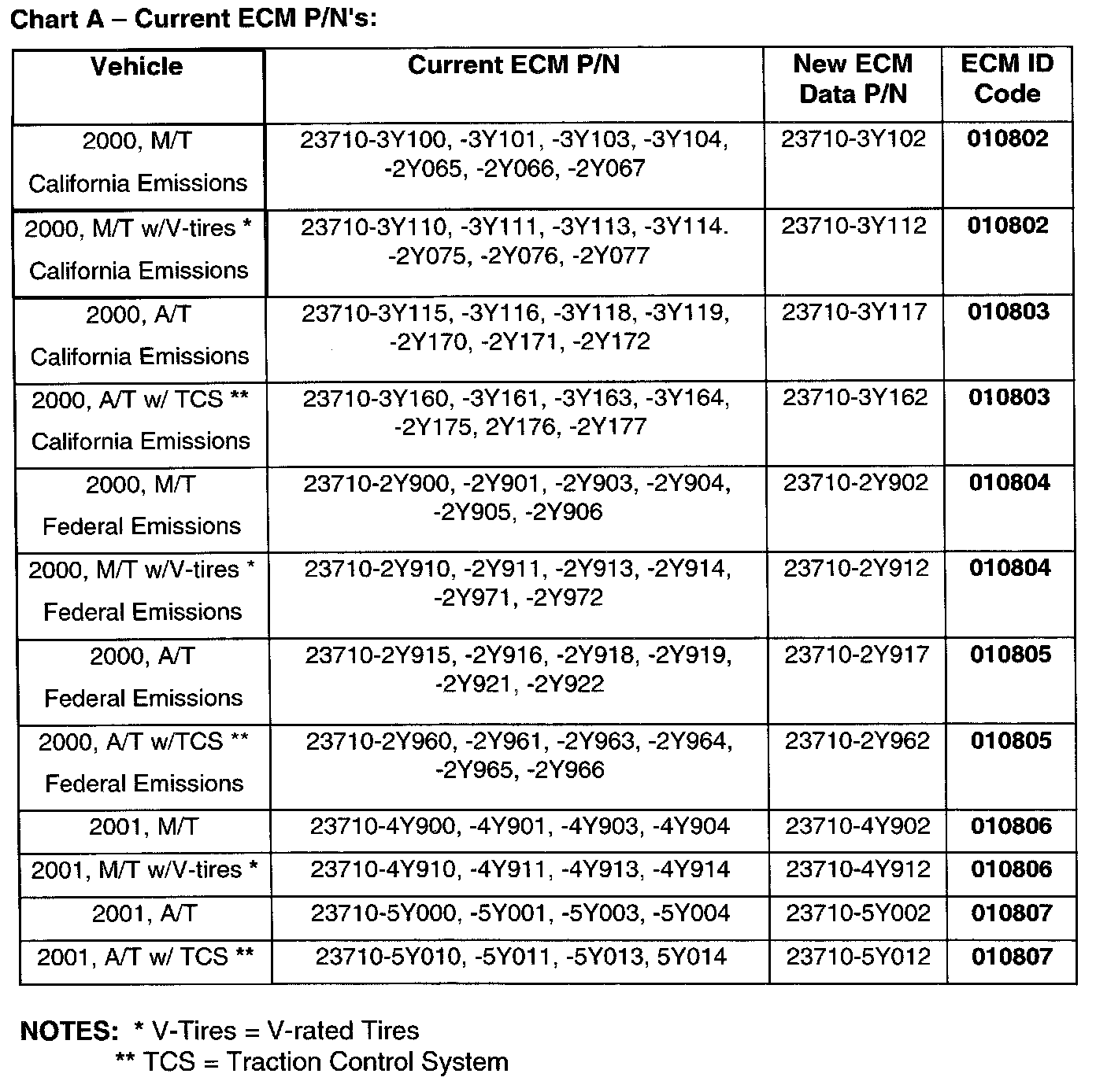 6. Compare the vehicle's ECM P/N to those shown under Current ECM P/N in Chart A shown: