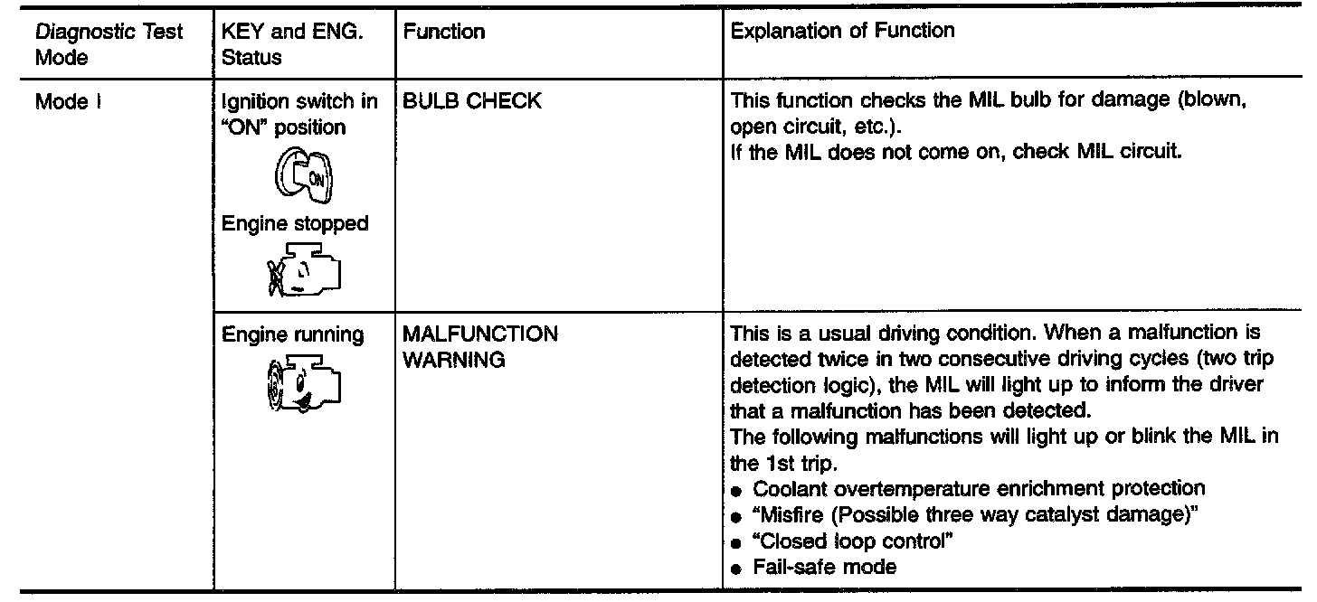 1. The MIL will light up when the ignition switch is turned ON without the engine running. This is a bulb check.