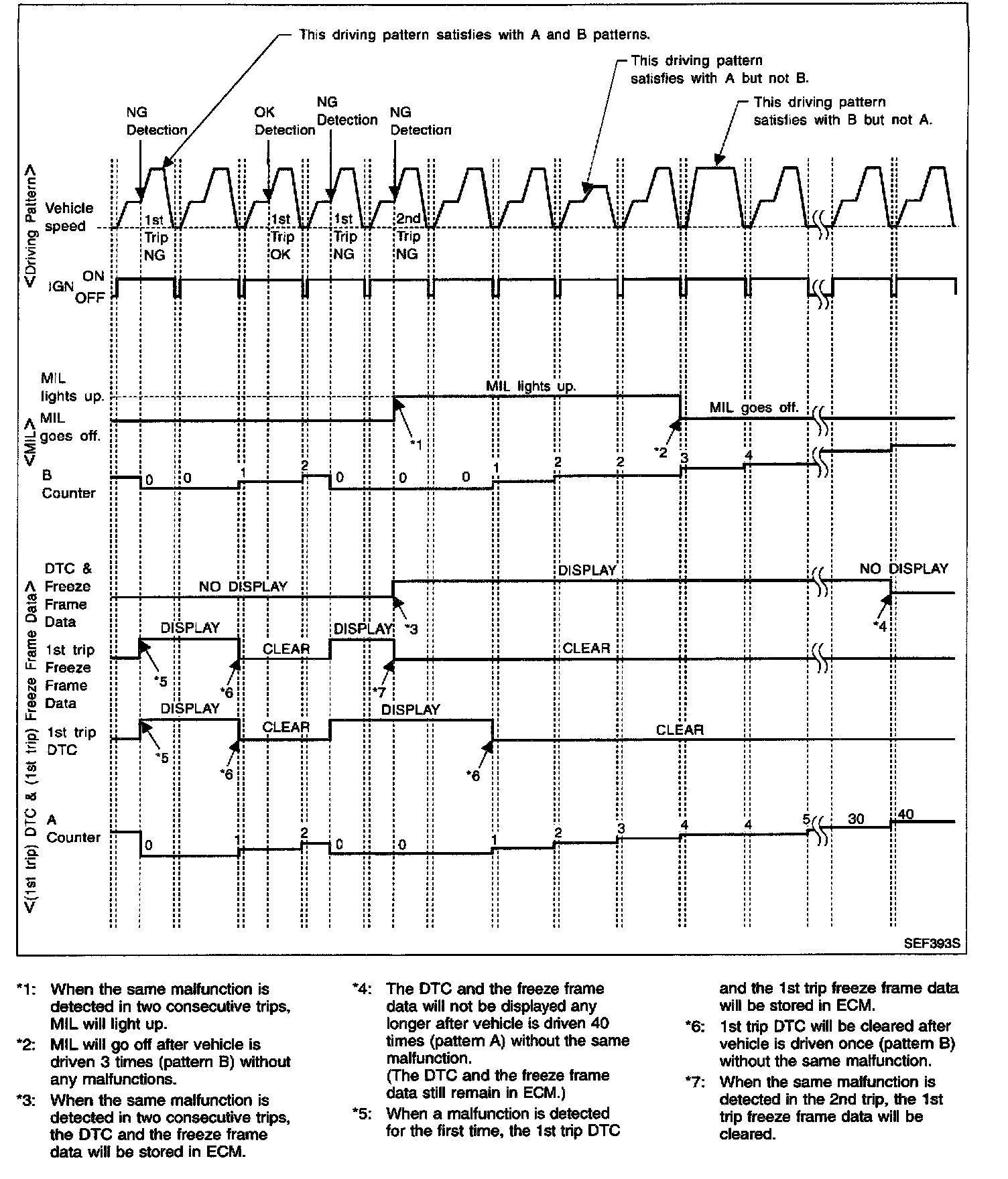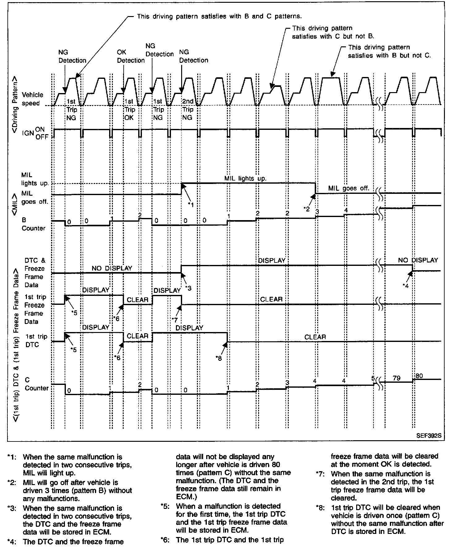- The DTC and the freeze frame data will be stored until the vehicle is driven 40 times (driving pattern A) without the same malfunction recurring (except for Misfire and Fuel Injection System). For Misfire and Fuel Injection System, the DTC and freeze frame data will be stored until the vehicle is driven 80 times (driving pattern C) without the same malfunction recurring. The "TIME" in "SELF-DIAGNOSTIC RESULTS" mode of CONSULT-II will count the number of times the vehicle is driven.