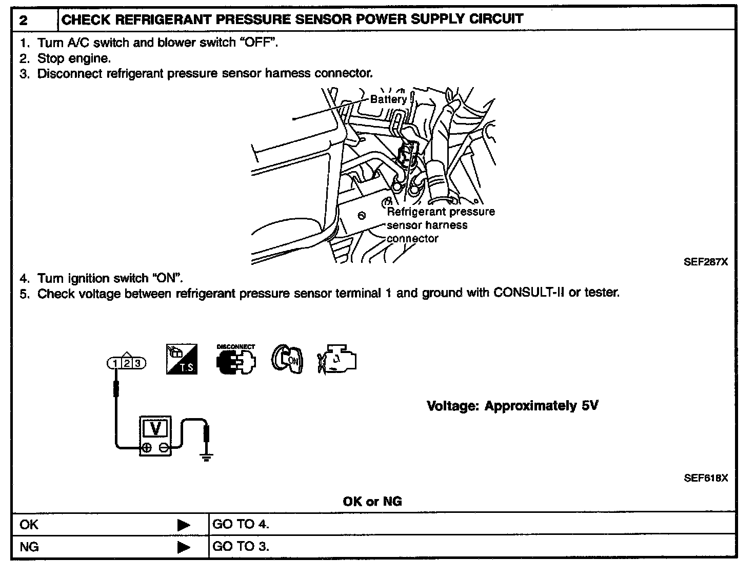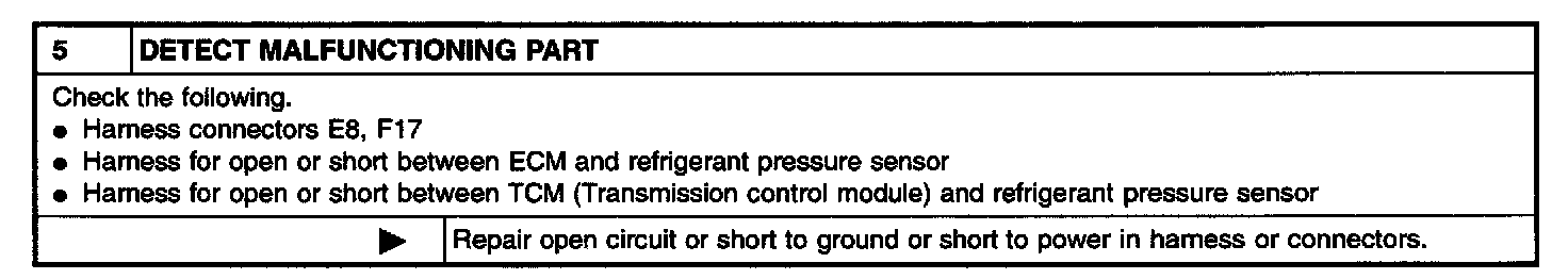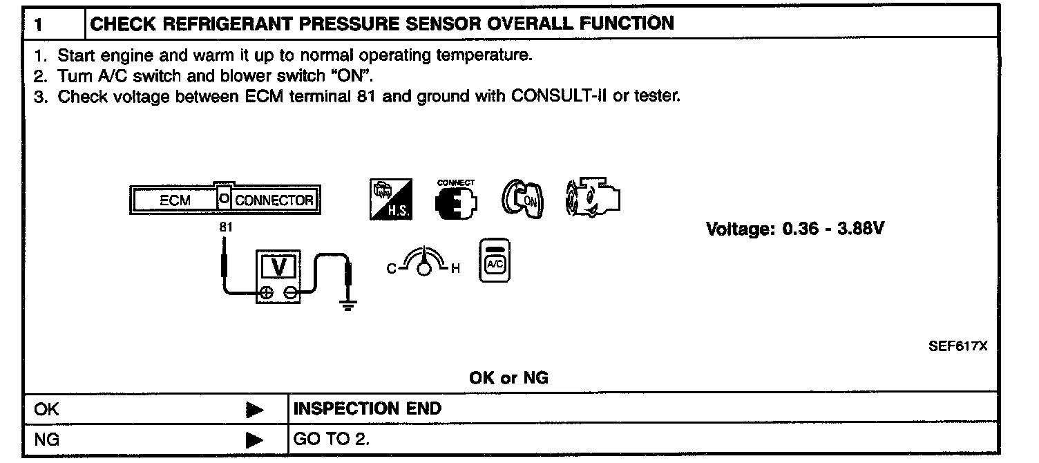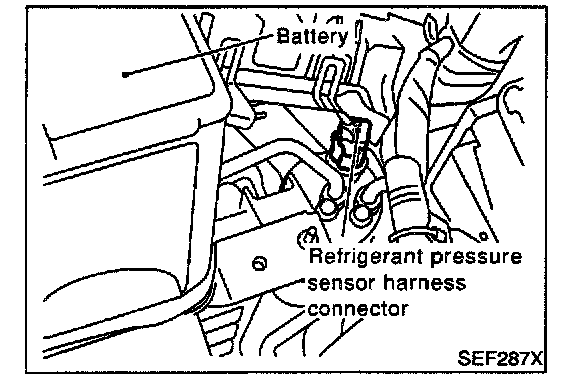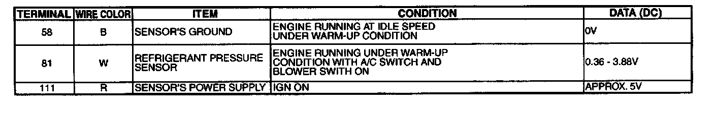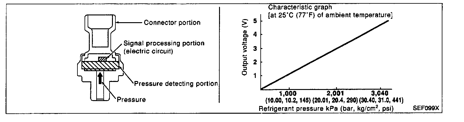 The refrigerant pressure sensor is installed at the liquid tank of the air Conditioner system. The sensor uses an electrostatic volume pressure transducer to convert refrigerant pressure to voltage. The voltage signal is sent to ECM, and ECM controls cooling fan system.