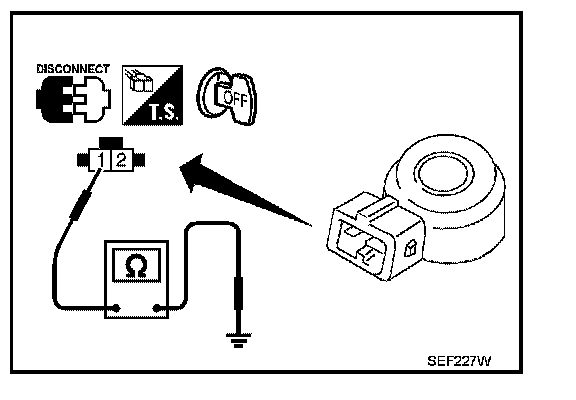 Check resistance between knock sensor terminal 1 and ground.