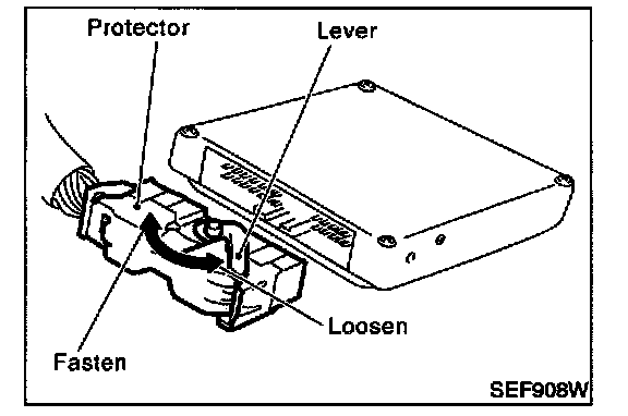 - When connecting ECM harness connector, fasten it securely with a lever as far as it will go as shown at left.