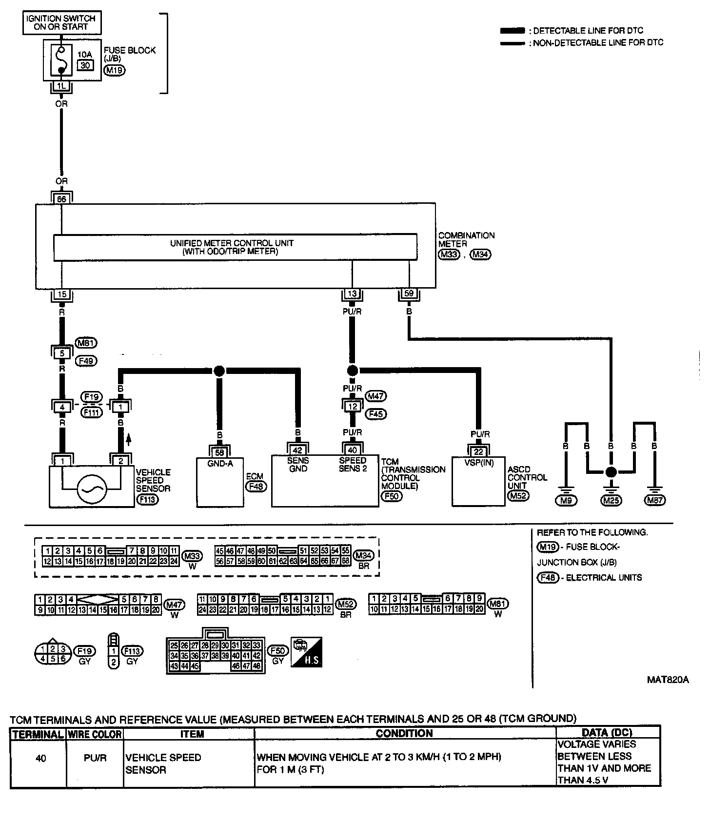 DescriptionThe vehicle speed sensor MTR is built into the speedometer assembly. The sensor functions as an auxiliary device to the revolution sensor when it is malfunctioning. The TCM will then use a signal sent from the vehicle speed sensor MTR.
