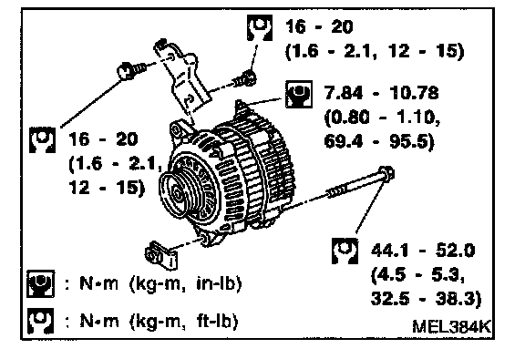 8. Remove alternator upper bolt and lower bolt.