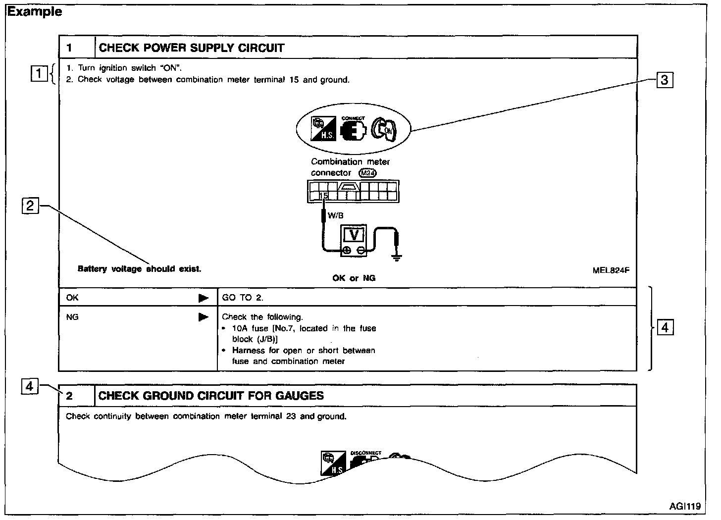 Symbols included in illustrations refer to measurements or procedures. Before diagnosing a problem, familiarize yourself with each symbol. Refer to "CONNECTOR SYMBOLS" and "key to Symbols Signifying Measurements or Procedures".