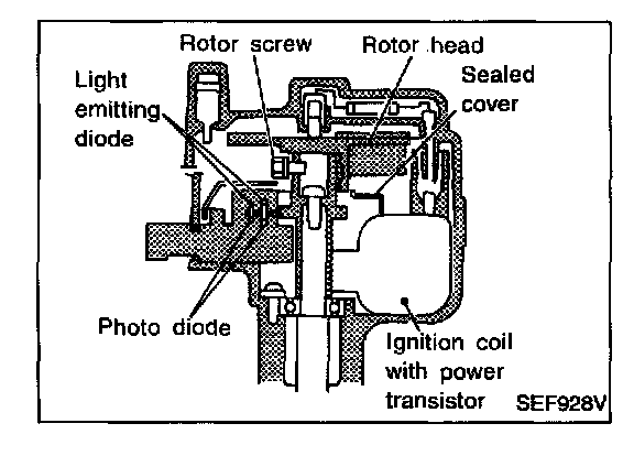 The ignition coil is built into distributor. The ignition signal from the ECM is sent to the power transistor. The power transistor switches on and off the ignition coil primary circuit. As the primary circuit is turned on and off, the proper high voltage is induced in the coil secondary circuit.