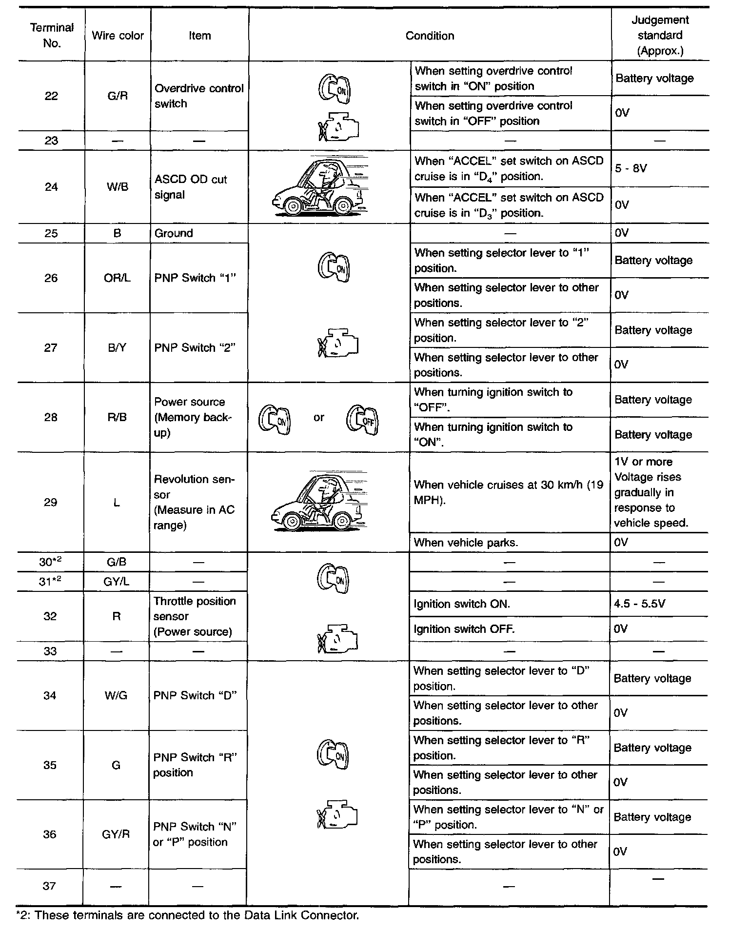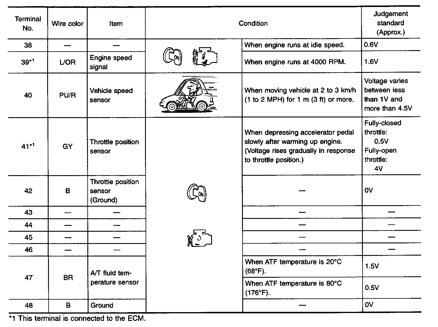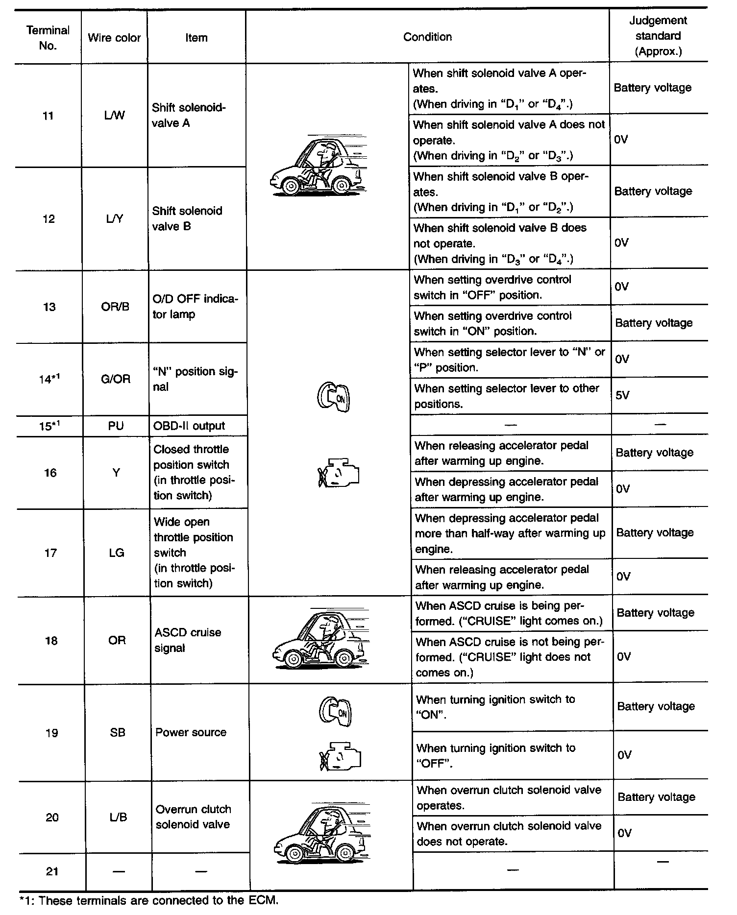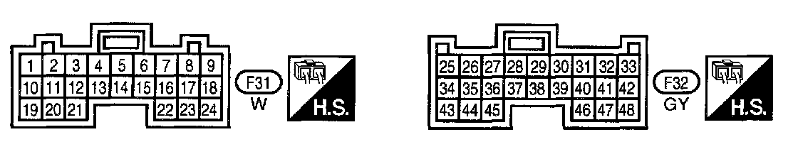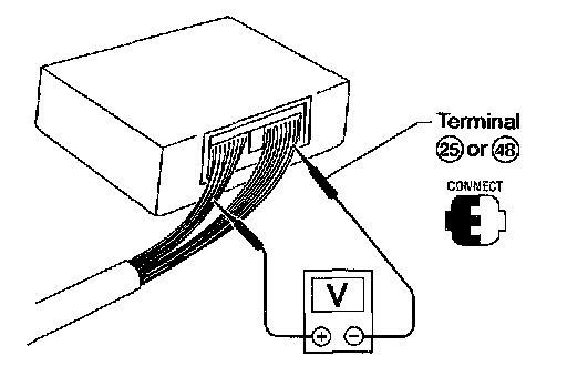 - Measure voltage between each terminal and terminal 25 or 48 by following "TCM INSPECTION TABLE".