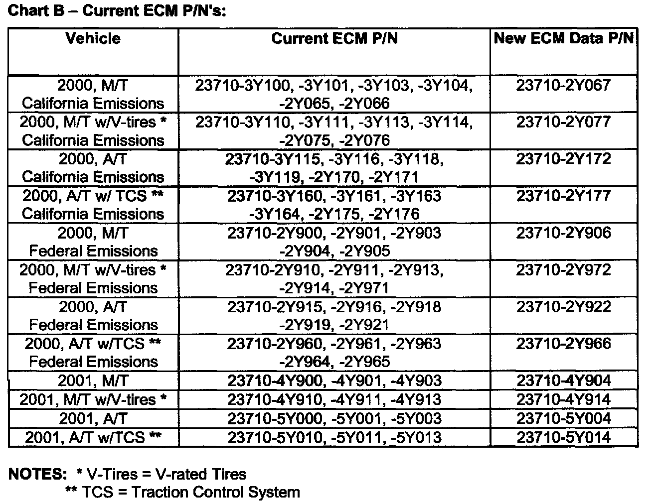 2. Compare the vehicle's ECM P/N to those shown under Current ECM P/N and New ECM Data P/N in Chart B shown.