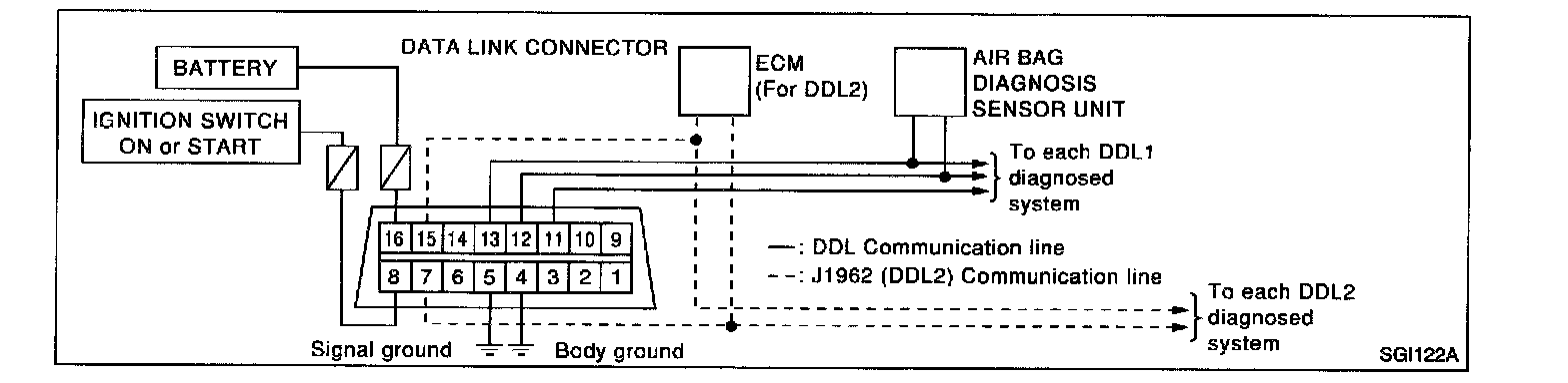 NOTE: The DDL1 and DDL2 circuits from DLC pins 12, 13, 14 and 15 may be connected to more than one system. A short in a DDL circuit connected to a control unit in one system may affect CONSULT-II access to other systems.