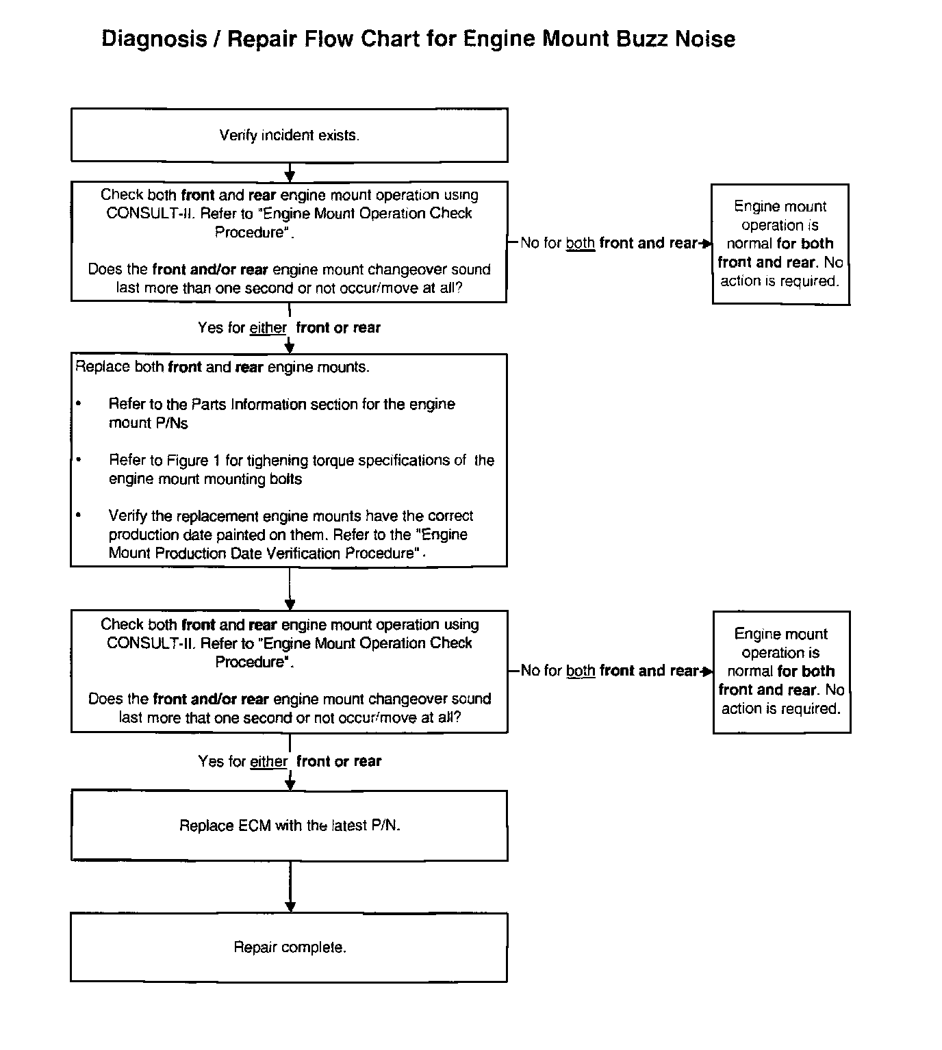 If an applied vehicle exhibits a buzzing noise coming from the engine compartment for several seconds after the ignition key is turned off, the cause may be the electronically controlled engine mounts. Use the Diagnosis / Repair Flow Chart to diagnose and repair the vehicle.