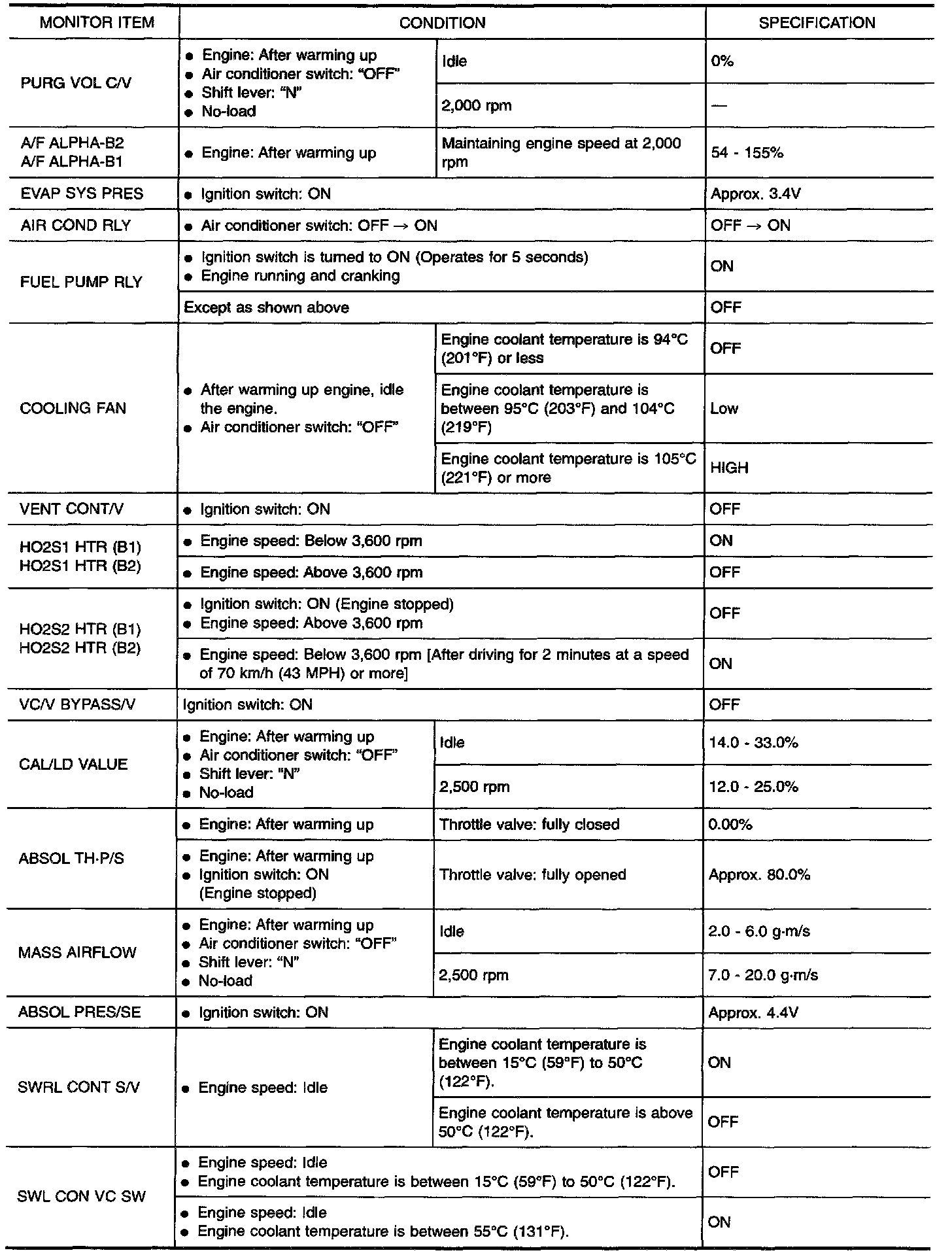 - Specification data are output/input values which are detected or supplied by the ECM at the connector.