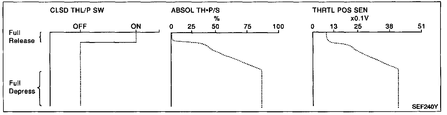 Below is the data for "THRTL POS SEN", "ABSOL TH.P/S" and "CLSD THL/P SW" when depressing the accelerator pedal with the ignition switch "ON".