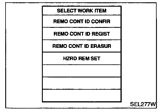 REMOTE CONTROLLER ID SET UP WITH CONSULT-IINOTE: If a remote controller is lost, the ID code of the lost remote controller must be erased to prevent unauthorized use. When the ID code of a lost remote controller is not known, all controller ID codes should be erased. After all ID codes are erased, the ID codes of all remaining and/or new remote controllers must be re-registered.