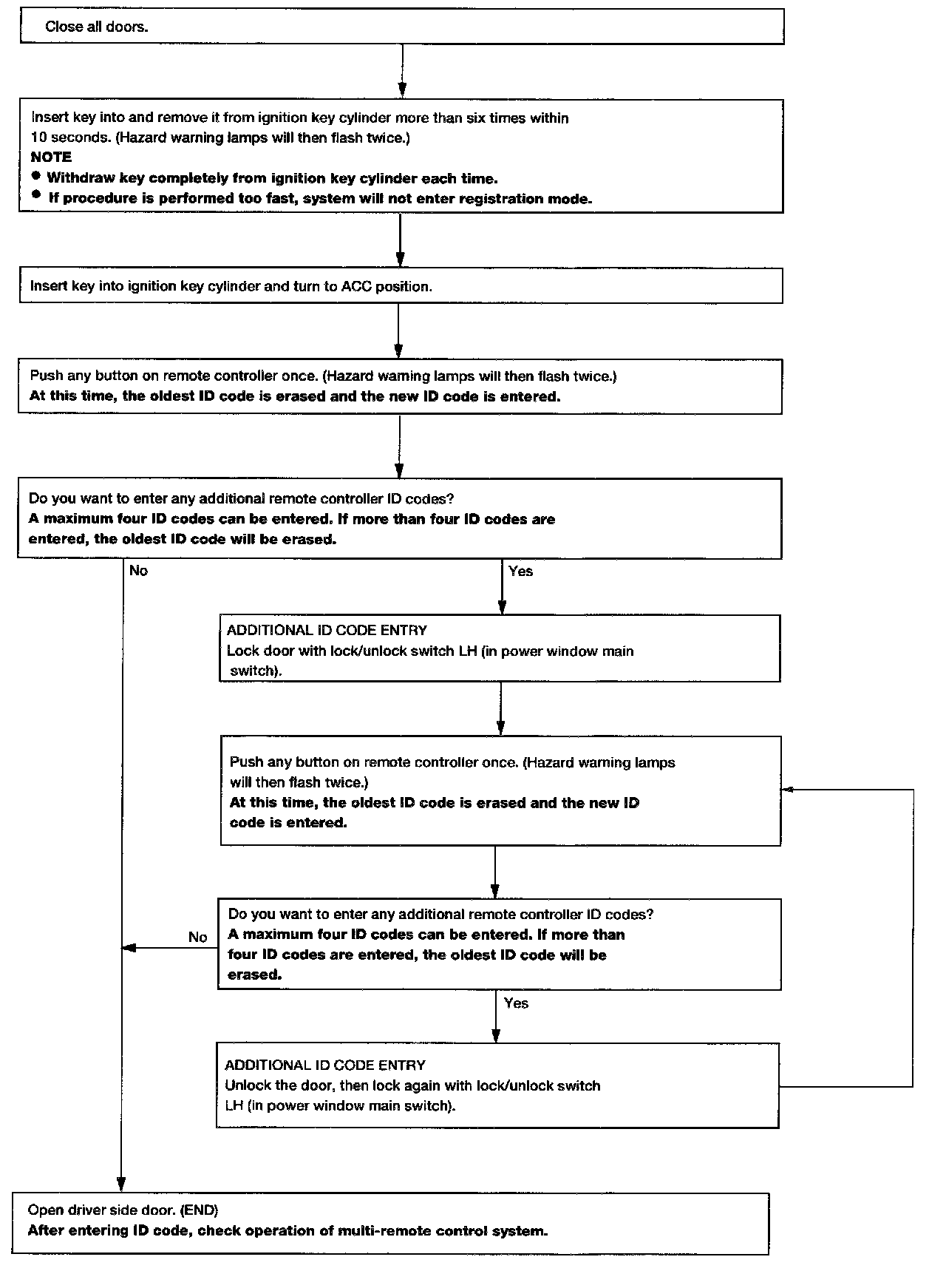 - When registering an additional remote controller, the existing ID codes in memory may or may not be erased. If four ID codes are stored in memory, when an additional code is registered, only the oldest code is erased. If less than four ID codes are stored in memory, when an additional ID code is registered, the new ID code is added and no ID codes are erased.