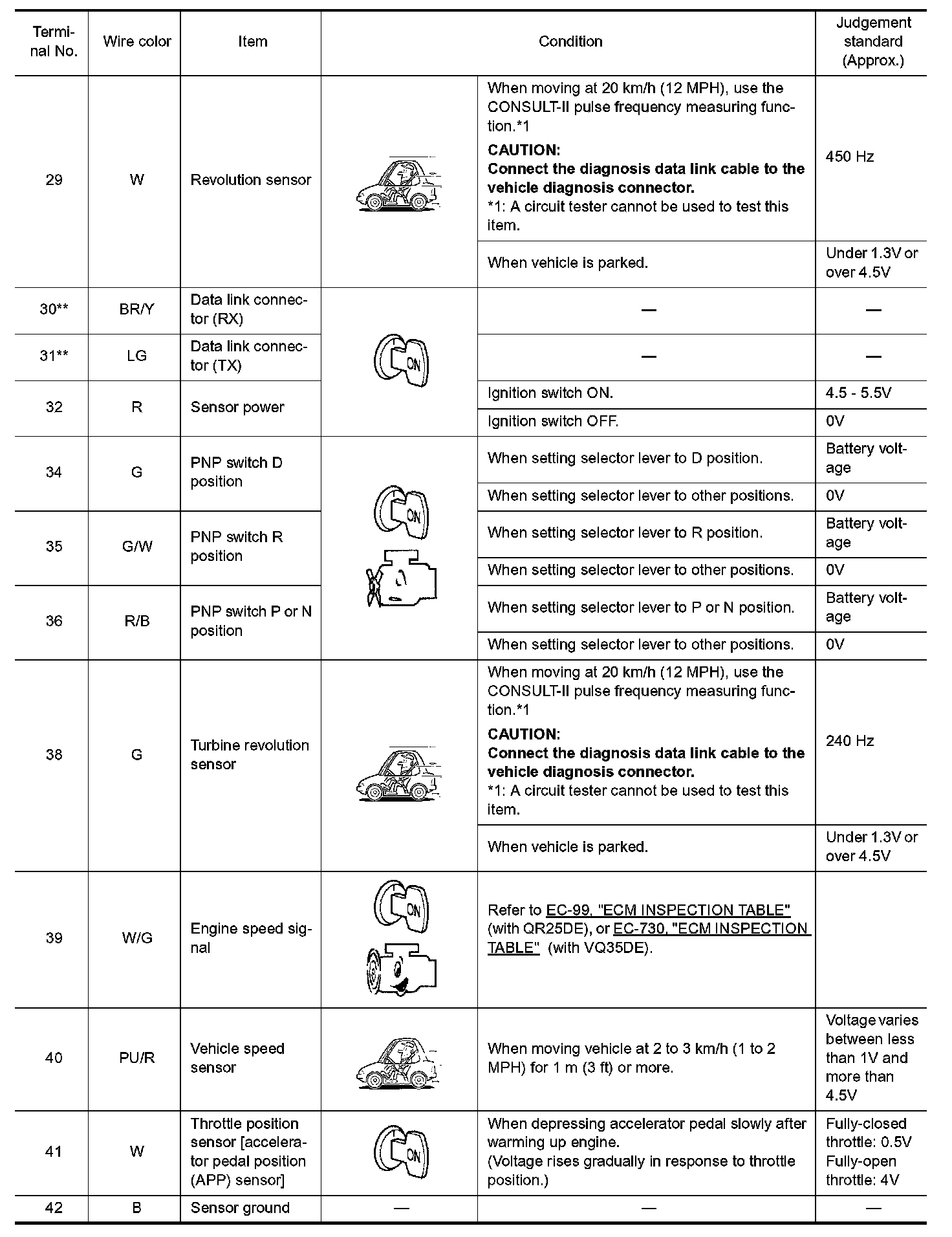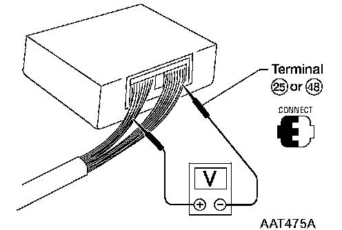 ^ Measure voltage between each terminal and terminal 25 or 48 by following "TCM INSPECTION TABLE".