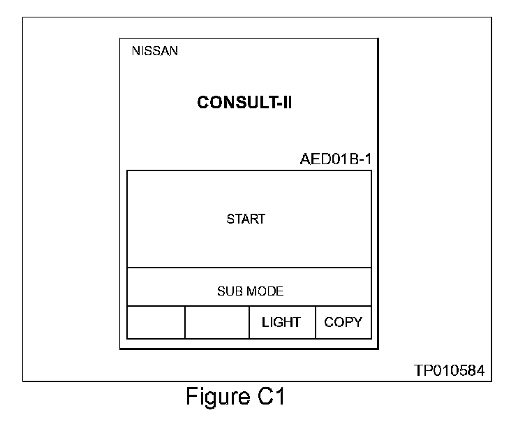 9. Make Sure the DLC-II cable is firmly plugged into the vehicle harness (see CAUTION below step 8). Turn the ignition switch "ON", but do not start the engine. CONSULT-II will turn on automatically (see Figure C5).