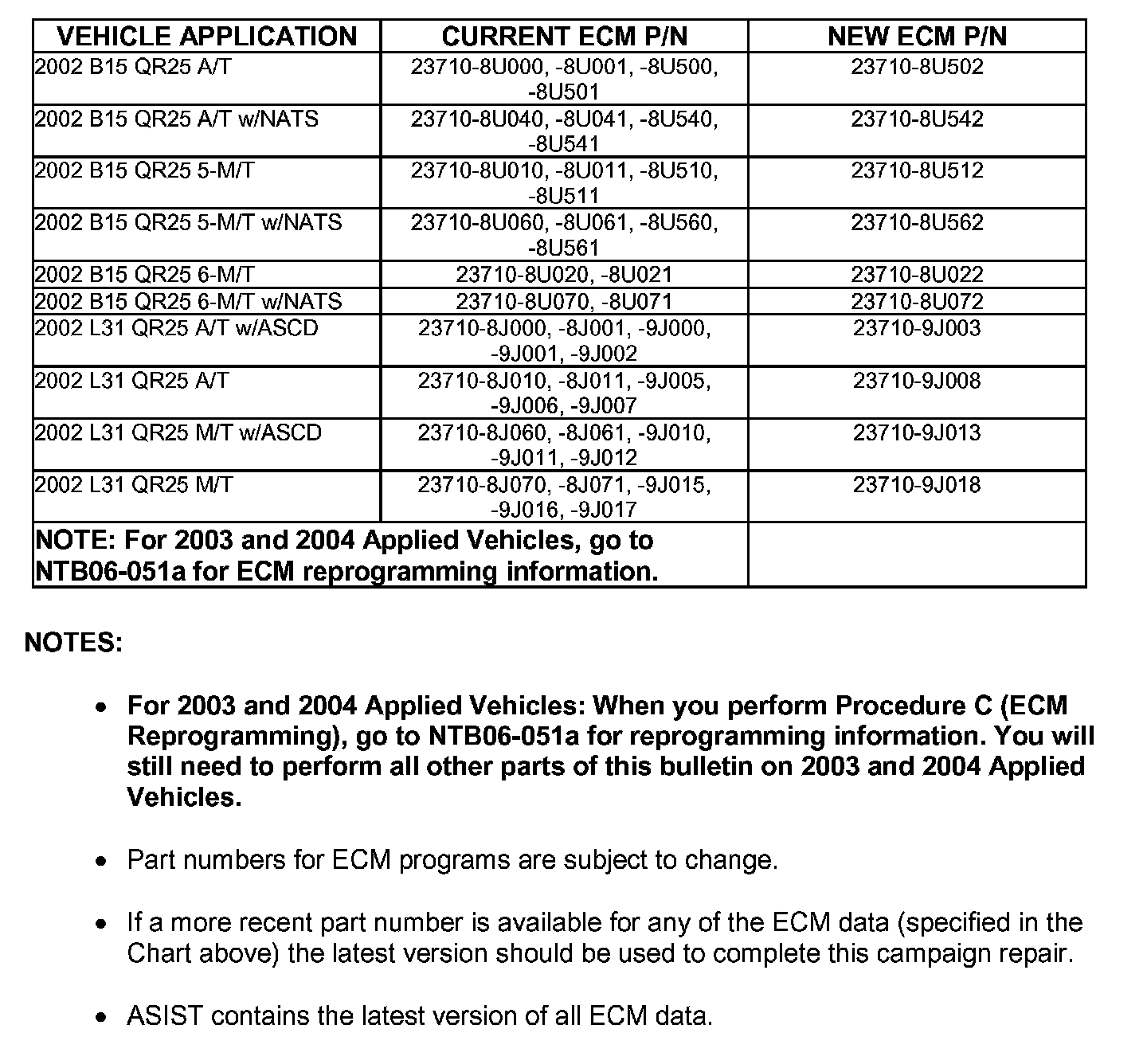 Procedure C - Perform QR25 ECM Reprogramming:For 2003 and 2004 Applied Vehicles: When you perform Procedure C (ECM Reprogramming), go to NTB06-051a for reprogramming information. You will still need to perform all other parts of this bulletin on 2003 and 2004 Applied Vehicles.