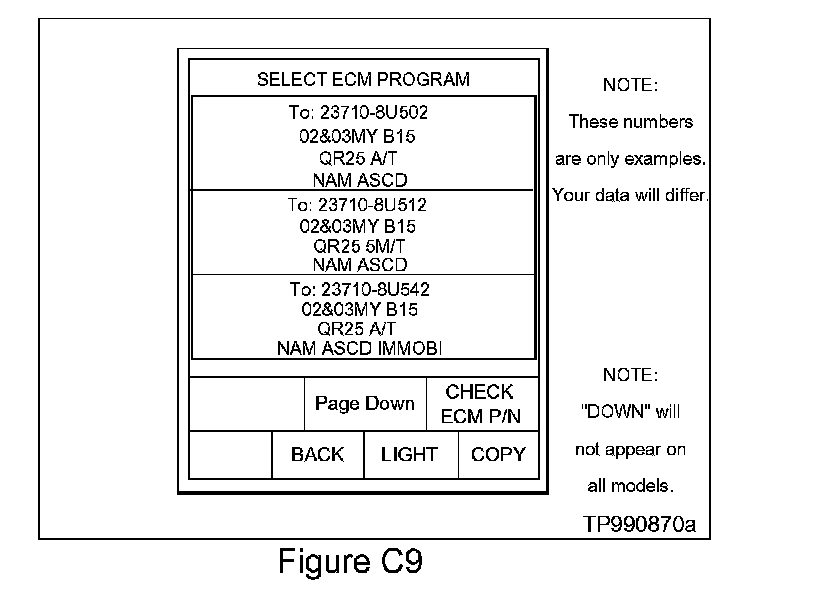 17. Now go to the CONSULT-II screen and select the correct ECM program to install from the choices on the screen (see Figure C9). Refer to the new ECM P/N note in the "number match" note you made in step 16.