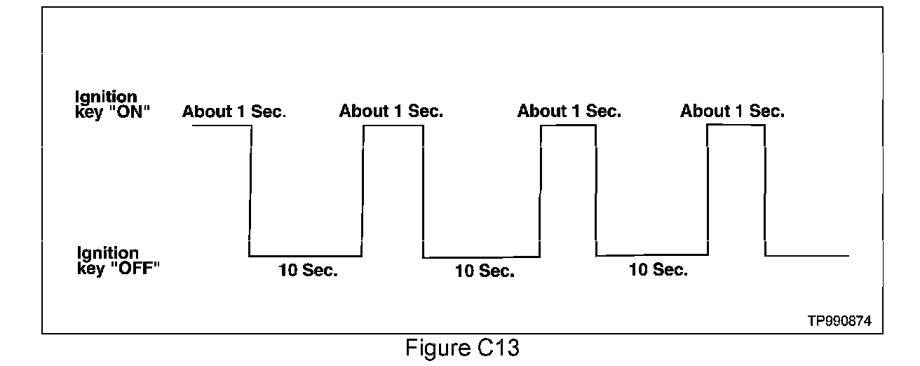 22. Wait more than 10 seconds, then turn the ignition switch "ON" for 1 second. Then, turn the ignition switch "OFF" again for 10 seconds.
