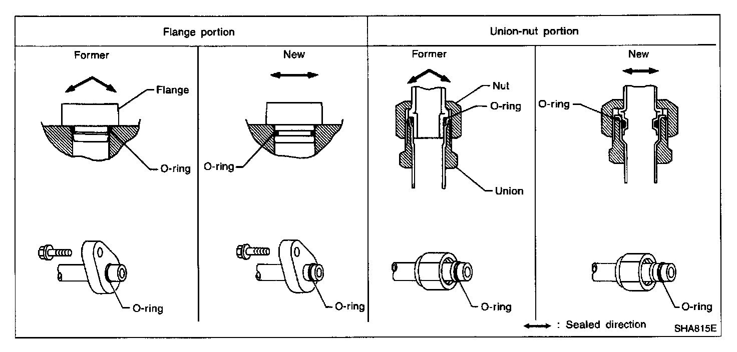 The O-ring has been relocated. It has also been provided with a groove for proper installation. This eliminates the chance of the O-ring being caught in, or damaged by, the mating part. The sealing direction of the O-ring is now set vertically in relation to the contacting surface of the mating part to improve sealing characteristics.
