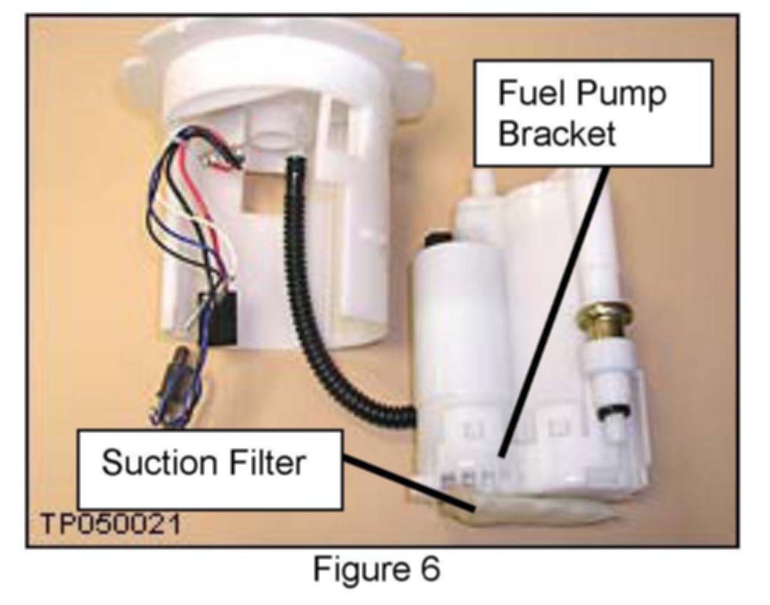 9. Carefully remove the fuel pump bracket shown in Figures 6 and 7.
