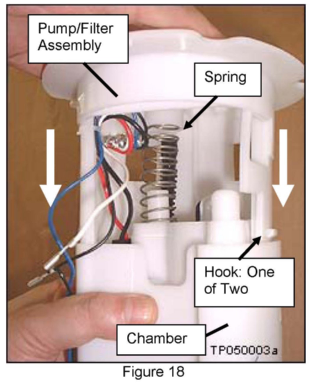 22. Carefully slide the fuel pump/fuel filter assembly into the chamber. See arrows on Figure 18.
